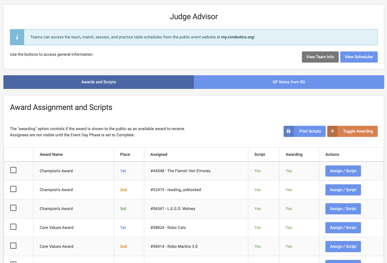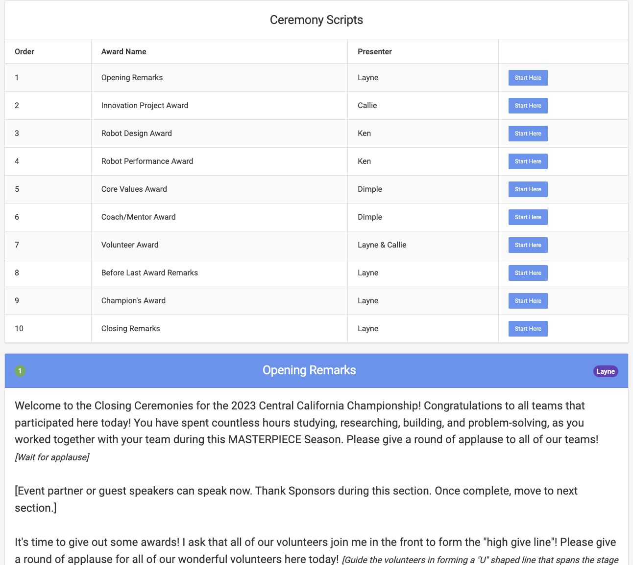 - Scripts for the awards ceremony are built into Lumieos, with the evergreen award descriptions from FIRST built in and space to edit for event specific script sections (from the judges)