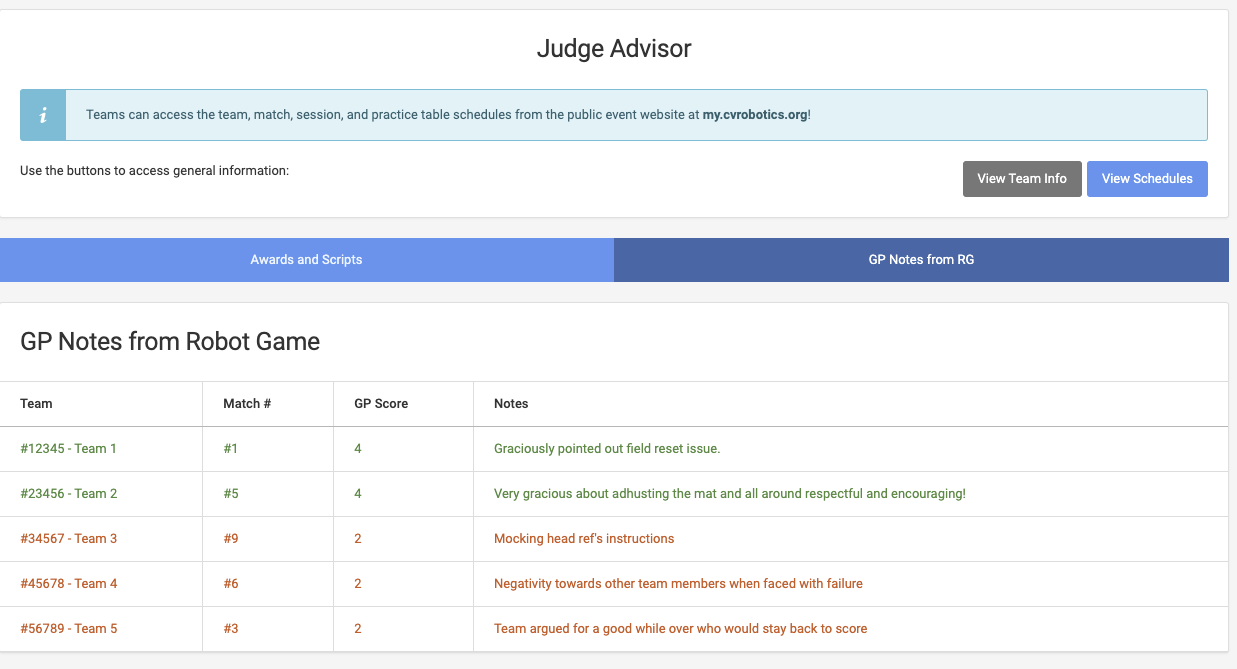 Digital Scoring is available inside of Lumieos. As long as referees have access to tablets and internet, they can access the digital versions of the scoresheets for the Robot Game portion of the challenge. There is even a section for the referees to enter the Gracious Professionalism (GP) score that the team earner for that match, and a section for the referee to fill out why they assigned that specific GP score. This allows the Head Referee and the Judge Advisor for the event to see the explanation in real time.