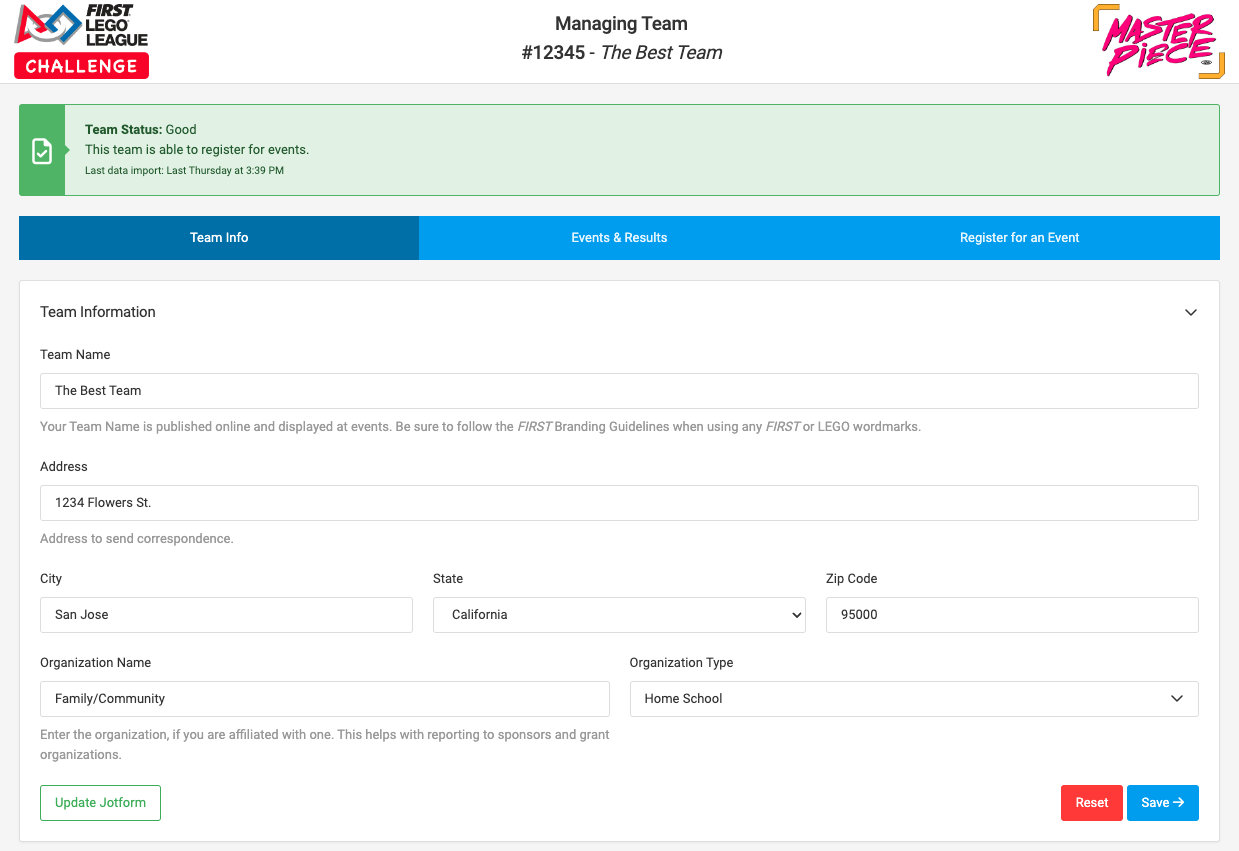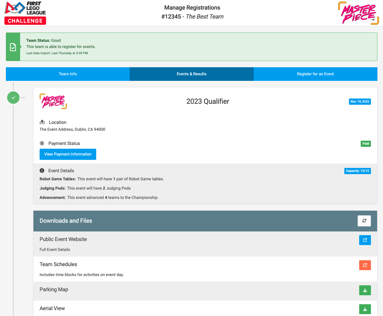 - If event staff marked the team as “Advancing”, then Lumieos will present and guide teams through the next level of registration.