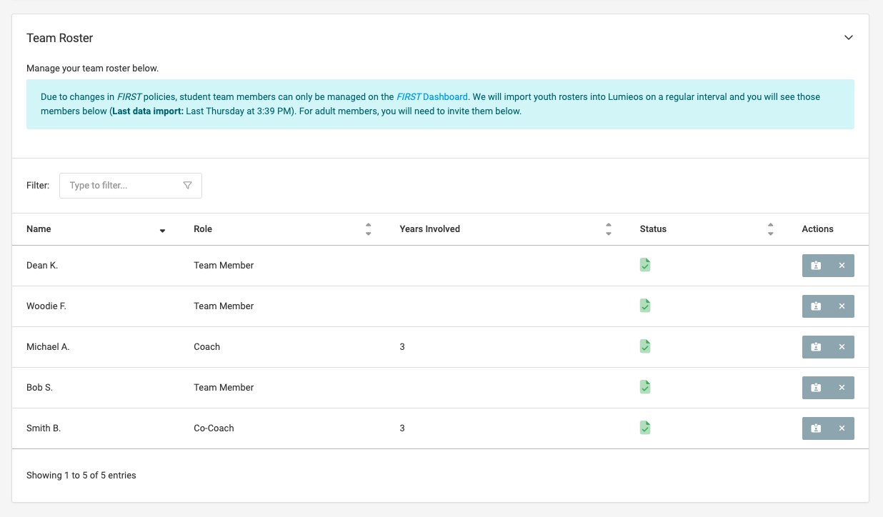 - Agreement status of coaches and team members. (C&R, custom forms, etc)